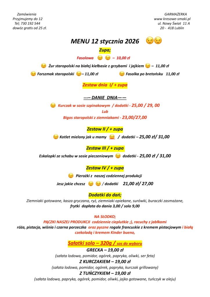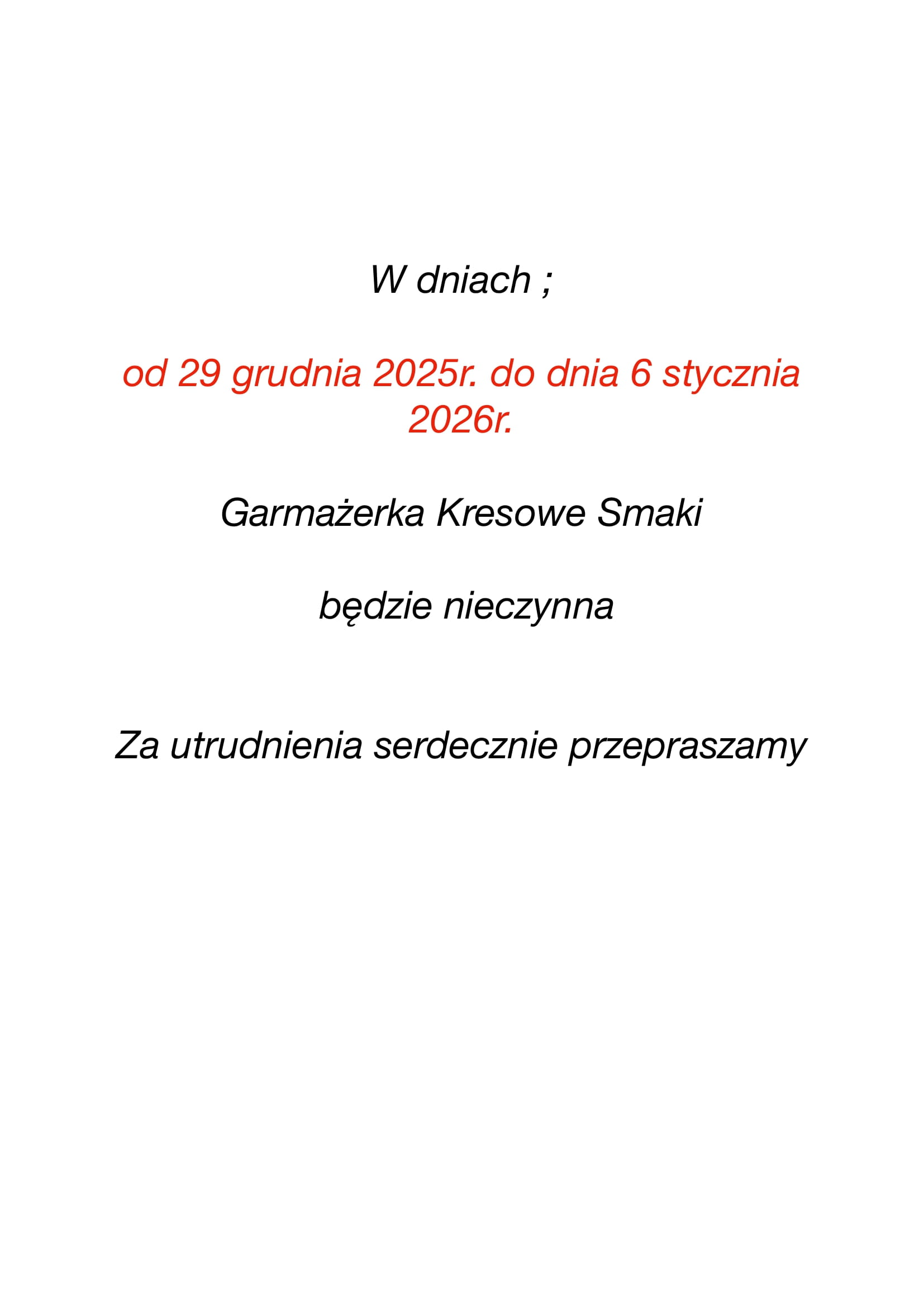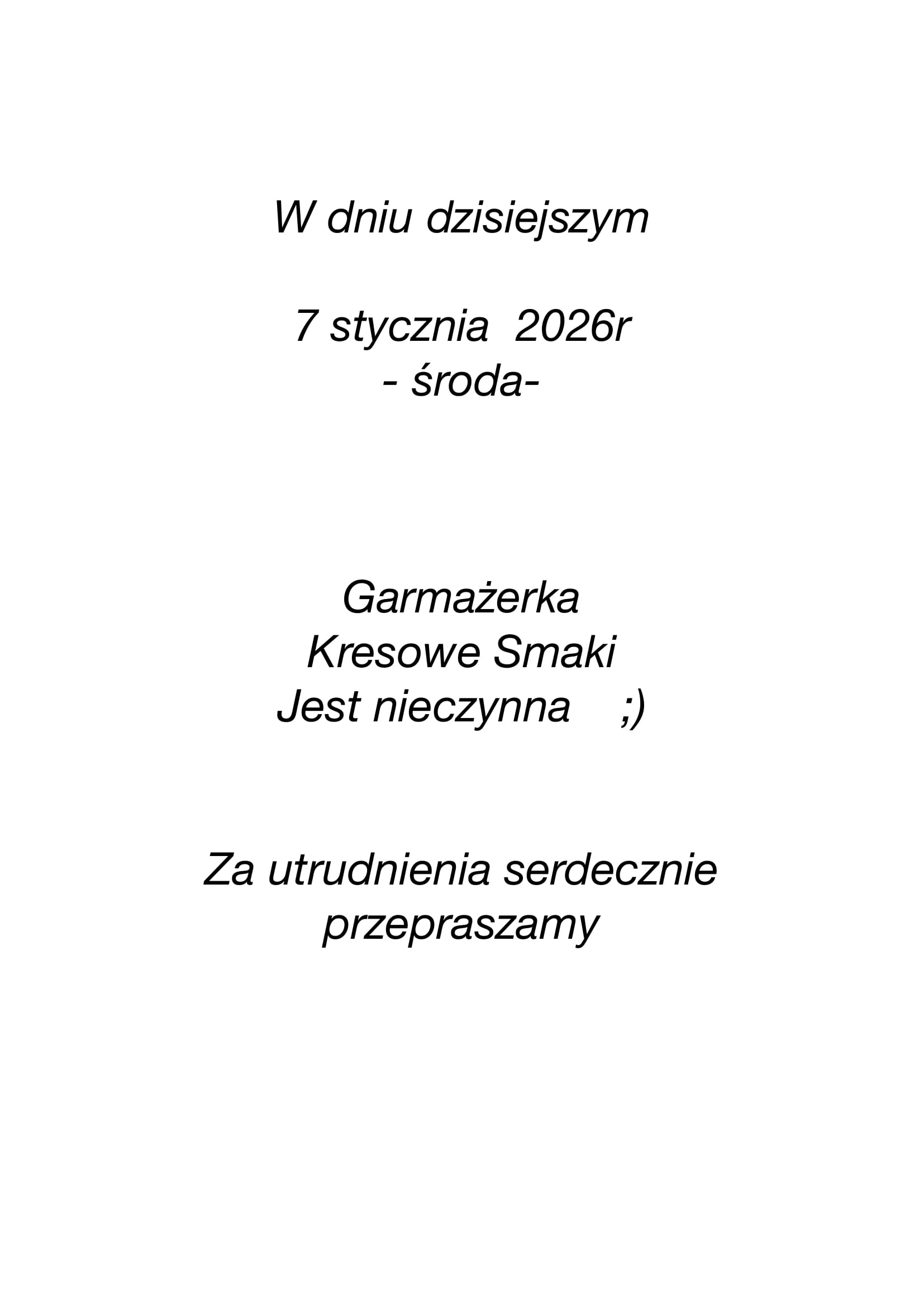W dniu dzisiejszym 7 stycznia – garmażerka będzie nieczynna – przepraszamy 7 stycznia 2026 Aktualności Czytaj dalej...